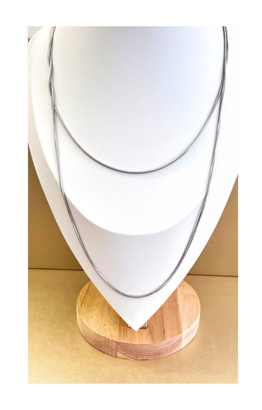 This elegant and simple stainless steel snake chain necklace, plated with luxurious 18k white gold, exudes sophistication and style. The sleek, smooth design makes it a versatile piece that complements any look, from casual to formal.